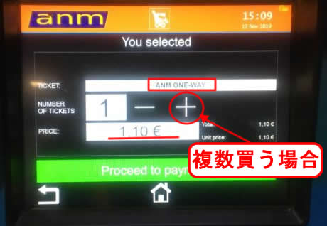 次の画面で料金の1.1ユーロを確認します、更に複数枚購入したい場合は「+」のボタンを押すと数字が増え、同時にその枚数を購入できます。