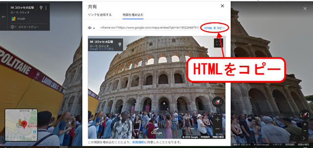 「地図を埋め込む」を選択すると、小さい画面の中に、埋め込んだ時に表示されるストリートビューが表示されています。これでよければ「HTMLをコピー」をクリックします。